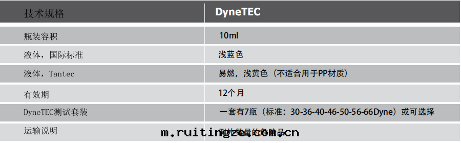 物(wù)體(tǐ)的(de)表(biǎo)面(miàn)能(néng)可(kě)通(tòng)过(guò)測量(liàng)接觸角(jiǎo)或使用(yòng)Tantec的(de)專用(yòng)測試墨(mò)水(shuǐ)(DyneTEC)進(jìn)行測定(dìng)。